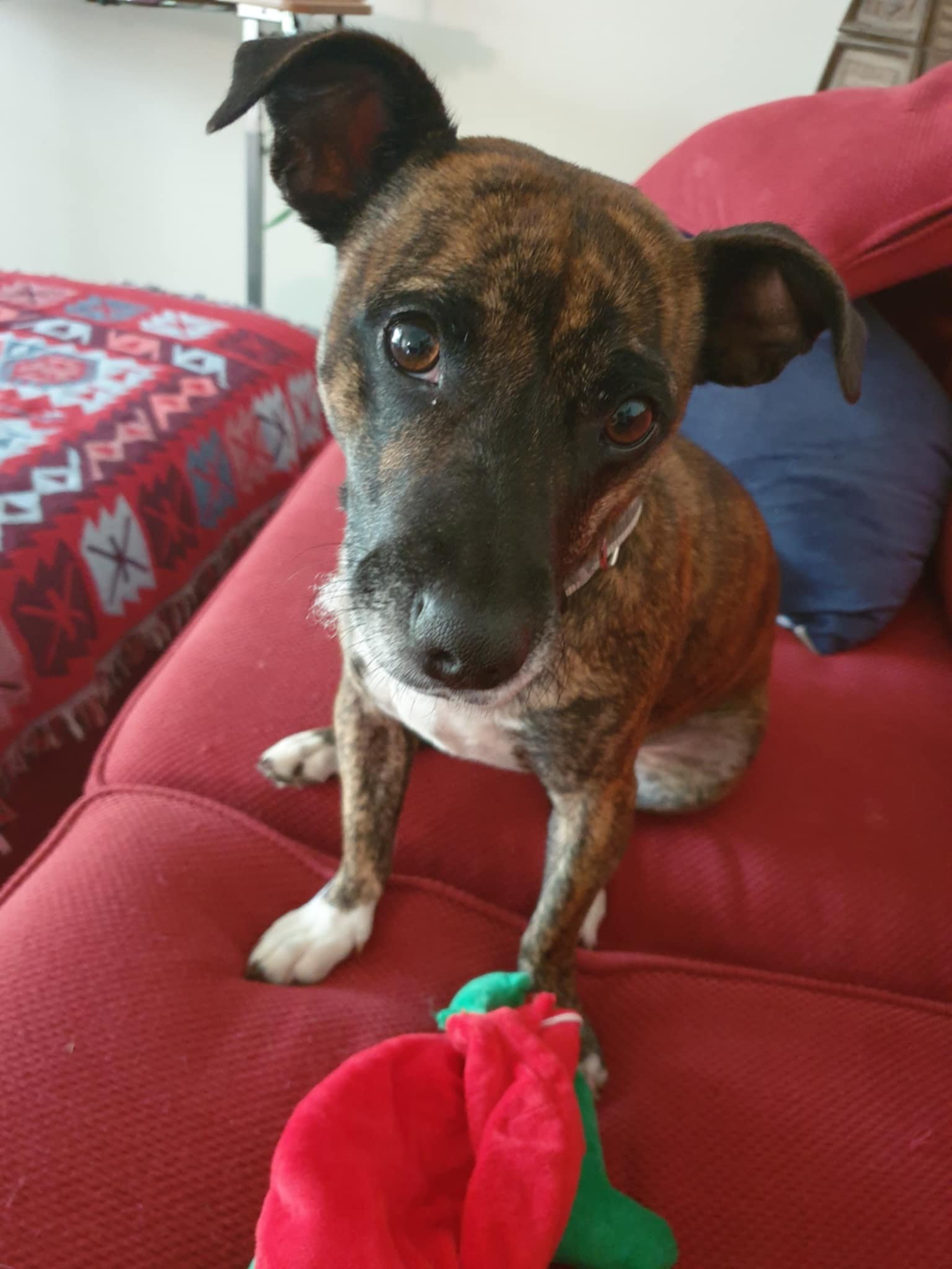 Before even getting to the questionnaires, I should mention that throughout the visit, Junah was doing everything she possibly could to command our attention. From the moment I arrived to after I left, Junah displayed endless excitement. While Carol and I were sat for the questions, she almost never stopped. She was jumping up at the table, running underneath the table, presenting us with toys, greeting the cats excitedly, rubbing her flank against me, licking my legs, and trying to nose my hand for scritches. When we ignored her, she often began to whine, then growl and even bark. In order for us to focus in, Junah either had to be held in Carol's lap, or playing with a rubber bone stuffed with treats.